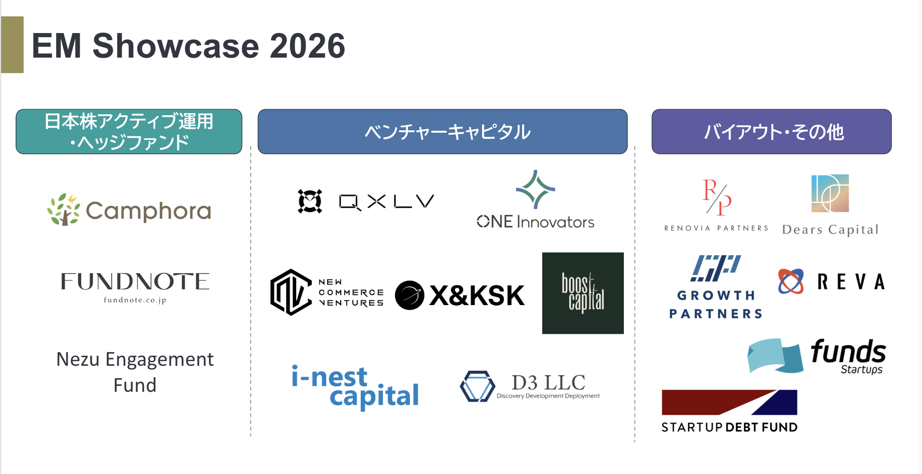 EM Showcaseは、国内外の機関投資家に「Emerging Managers(EM)」の認知度を高めることを目的に国内の注目すべきEMを紹介する取組みです。